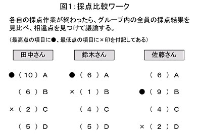 | 5 | 各自で採点が終わったら、グループ内でその採点結果を見せ合い、相違点を見つけて「なぜその差が出たのか?」を議論します。 |