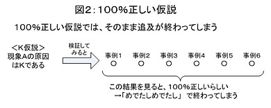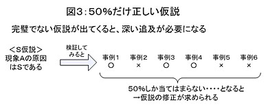 間違った仮説といっても、まったくどの事例でも当てはまらない仮説というのはなかなか出てきません。通常は程度の差はあれ○と×が混在してくるのが普通です。こういう場合は「仮説の修正が求められる」ため、より深く考えざるを得ません。それが「問題の理解を深める」上で非常に役に立つのです。