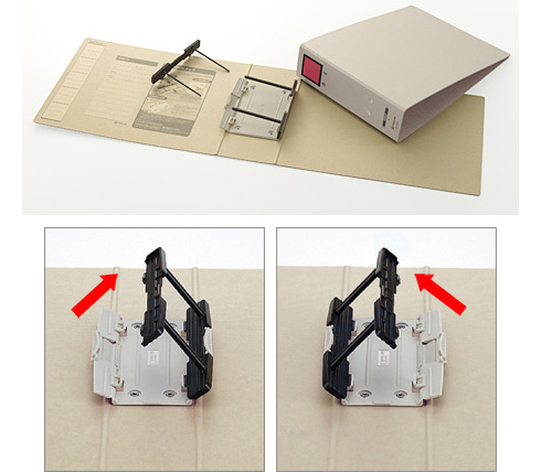 「キングファイルスーパードッチ<脱×着>」シリーズはとじ具と表紙が分離できるタイプのパイプ式ファイル。新発売の「キングファイルスーパードッチ<脱×着>イージー」では、取り外しをより簡単にしたという。まず、左右両開きのとじ具の上下2カ所に付属するフラップを上げてロックを解除。続いて、フラップの下の部分に指をかけて上下同時にスライドして持ち上げると、表紙からとじ具を外せる仕組みだ。