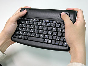 今回紹介するワイヤレスキーボード「RBK-207WT」の最大の特徴は、立ったままの文字入力に適していること。本体幅は218ミリと一般的な109キーボードの半分以下しかないので、PDAや電子辞書と同じ感覚で、両手でホールドしたまま親指による打鍵が行えるのである。いちいちキーボードを机の上に置いて打鍵する必要がなく、プレゼン中に立ったまま使うにはピッタリの製品だ。重量も370グラムと、まさにPDA相当である。