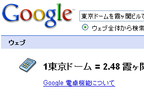 GoogleのWeb検索で便利な機能といえば計算機能だが、こちらもアップデートした。これまでも計算式をそのまま入力したり「〜を〜に(で)」という入力したりするとで計算してくれたが、今回のアップデートで「〜を〜に(で)」の入力方法を強化。「東京ドームを霞ヶ関ビルで」というように、一般的な数値の単位以外に建物なども単位として利用可能になっている。また、尺貫法にも対応した。