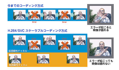 通常のシステムでもパケットロスがない時の映像は、1コマごとの軌跡を自動的に予測して、動いている部分だけを補正し、自然で滑らかな動きに見えるようにしてある。ところがパケットロスが2〜3%生じると、この補正機能が働かなくなる。そのため、映像がカクカクしてしまう。