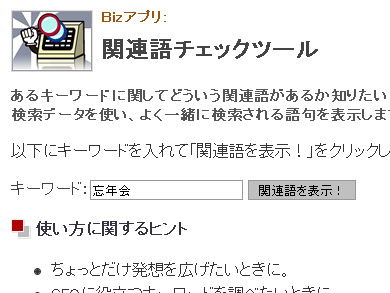 「関連語チェックツール」は、Yahoo!JAPANの検索データを使い、一緒に検索されることの多い語句を表示するWebアプリです。アイデアが欲しいキーワードを入力して、「関連語を表示!」ボタンをクリックしましょう。