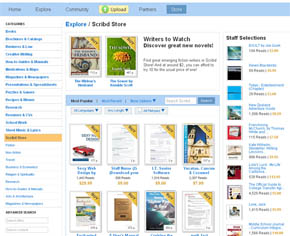 Scribdは、テキストファイル、PDF、Wordなどの文書をオンラインで公開できる無料サービス。公開した文書は、Flashを使ったビュワーを使ってブラウザから閲覧することができる。Scribd Storeはこのサービスを応用したもので、誰でも自分の小説や論文などのオリジナル文書をアップロードして販売できる。文書はPCや携帯電話などさまざまな機器で閲覧可能だ。