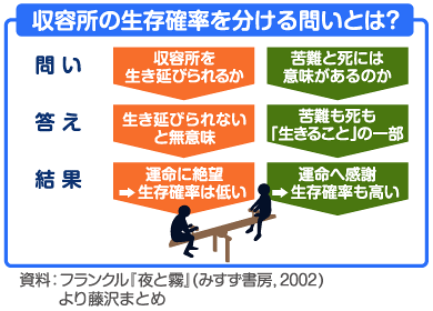 心理学者でもある著者のフランクルは、ユダヤ人だったためナチスにより強制収容所へ送られた。収容された人々の中で、生きることを放棄した人と希望をもった人では「問い」が違ったという。