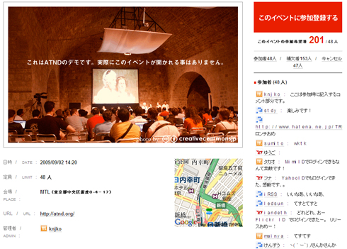 ATNDはシンプルに使えるイベント管理ツールです。誰でも開催したいイベント情報を掲載できます。地図も入るイベント告知ページやアンケート機能を備えています。