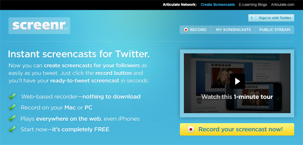 Screenrはブラウザで簡単にスクリーンキャストを作成できるサービスです。Twitterでログイン、作成後はTwitterでURLをつぶやける機能を備えています。