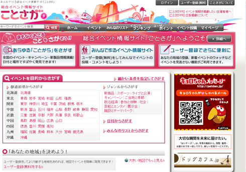 | 概要 | まもなく起こる「こと」を「さが」せるサービス。イベント情報を地図やジャンル、日時などから検索できる |
