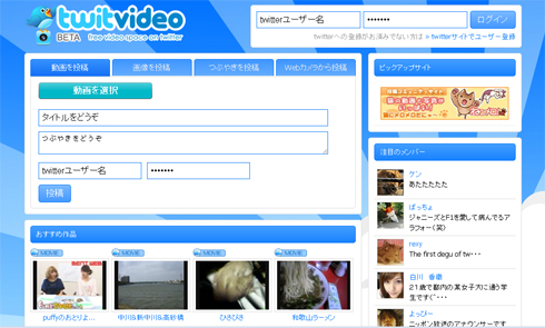 twitvideoは、PCのローカルにある動画や画像をアップロードでき、アップロード先のURLをTwitterのつぶやきとして投稿できるサービス。ユーザー登録は必要なく、Twitterのアカウントさえ持っていれば利用できます。携帯電話からの投稿にも対応しています。