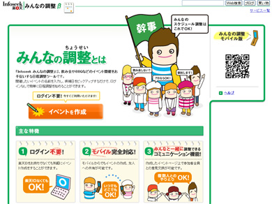 | 概要 | ログイン不要、携帯電話からも使える予定調整サービス |
