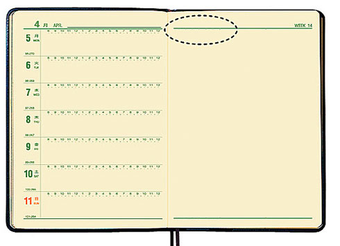 左が予定表、右が自由記入なのは能率手帳の定番デザイン。よ〜く見ると、右ページに翌朝7時までの予定が書ける“午前時間ドット”がある。「ワークライフバランスがなかった時代の名残り」と一同笑いあった。さらに週間カレンダーのページの右隅に次月のカレンダーがひっそりと表示されるのだが、これは月の最後の週だけで、ほかの週にはないという心づかい。こんな工夫の積み重ねが、発売60周年のブランドを支えている。