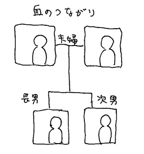 また、「頭がよくなる図解思考の技術」で何度か説明しましたが、血のつながり(夫婦や親子)を「−」で結び、対立や相愛は「⇔」で結びます。