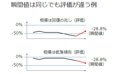 例えば「2607戸」と「28.8%減」という数字。これはいずれも瞬間値です。「16カ月連続のマイナス」とあるので、最近の相場は前年比で一貫して低いことは推測できますが、それだけでは「28.8%減」という数字の意味はピンと来ません。極端な話、下記2つのパターンはいずれも「16カ月連続前年比マイナス」と「瞬間値28.8%」に当てはまりますが、その評価は正反対です。