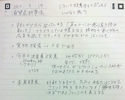 | 1 | 未来検索 | 行動履歴から、だぶんアナタはこうなる、こういうものを好きになる(興味を持つはずですよ)というのを表示する |