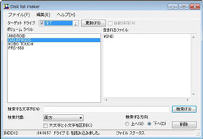 ターゲットとなるリムーバブルドライブを指定できる。今回はひとまず「全て」にチェック。リムーバブルメディアを挿入すると、含まれるファイルおよびフォルダが読み込まれて表示される。頭に「\」がついているのはフォルダリストを作成する対象となるボリュームは任意に指定できるので、例えばDドライブに挿入されたCD/DVDはすべてリスト作成の対象とし、Eドライブに挿入されたメモリカードはリスト作成の対象から外す、といった具合に個別に設定できる。検索機能もあるので、任意のファイルを見つけるのも容易だ。