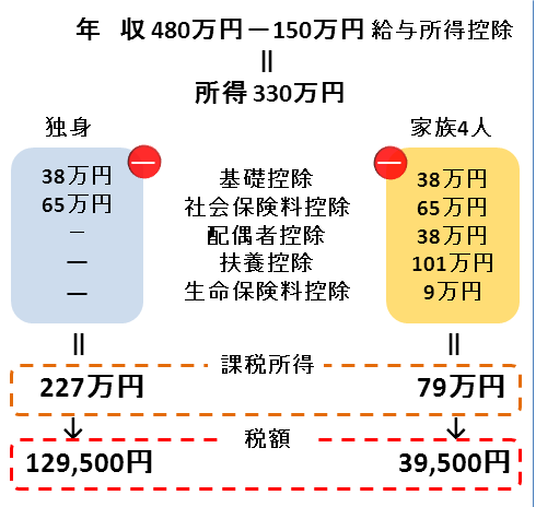 同じ480万円の年収で独身と家族4人で所得税は9万円、住民税は約13万円、合計約22万円差となった。この差の元となるのは各種所得控除の差だ。奥さんがいる控除、子供がいる控除、生命保険に入っている控除などで独身の人より納税額が少なくなっている。図の金額を算出した計算式、控除の内訳を一応書いておくのでご自身の税金を計算する方は参考にしていただきたい。