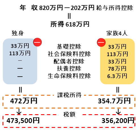 年収が820万円に増えると、年収が同額でも所得税で約28万円、住民税で約12万円、合計約40万円の差となった。年収が増え税率が上がったため差が拡大した。しかし、40万円はそれなりに大きな金額だが、年間40万円で家族3人を養えるわけはない。50歳男性の2割が結婚していないというニュースを聞くと、税制面では子育て環境が整っているとは言えず、ますます少子化が進みそうな感じがする。こちらも計算式を書いておこう。