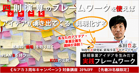 連載「新規事業アイデアの授業」は、5年にわたる人気講演「新規事業アイデアを生み出す実践フレームワーク」(講師:永田豊志、提供:Nアカデミー)から一部抜粋し、編集したもの。