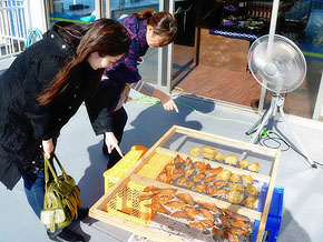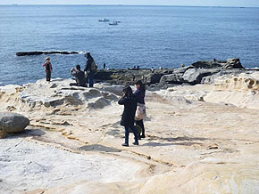 さて早速千畳敷に出発。東急ハーヴェストクラブ南紀田辺から車で30分ほど走ると到着。広い! 海がキレイ♪ 向こう側には三段壁も見えて、これぞ絶景。千畳茶屋の前に回るイカ。ほう、こうして干物を作るのか……。それを狙う私たち。