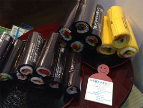 海苔巻きのようなタオルは、「もらった時はうれしいが、そのあとは気恥ずかしくて実際に使えない」という、ジョークグッズにありがちな欠点を解消すべく開発した製品。巻くと海苔巻きのように、開くとカラフルなタオルになるようデザインしている。