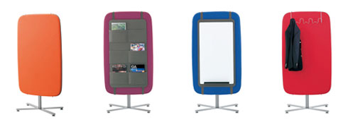 張り地で覆われたソフトなフォルムのスクリーンには、上部にピンが設けられており、各種のオプションを取り付けることができる。ちょっと小洒落たホワイトボードにも、マガジンラックにもコートハンガーにも変身する。