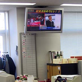 執務スペースのどの席からも目が届く場所に、天井から大きなディスプレイが吊るされている。ディスプレイに映っているのは、総務部門が編集した「今、社内で共有したい内容」だ。例えば今月誕生日を迎える人の一覧や、よい営業成績をあげた人の名前など。リンクアンドモチベーショングループは、今回訪れた銀座本社のほか、汐留に東京支社、そのほか大阪と名古屋にオフィスを持っている。どのオフィスのディスプレイも表示する内容は同じだという。