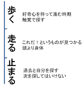 そして、ある程度自分の軸が定まってきたら、それに合うものはないだろうかという感じで、また歩く時期に進む。人間は歩く、走る、止まる、歩く、走る、止まる……をずっと繰り返しているわけです。このスパンは人によって違っていて、下手したら1〜2週間で来る人もいるし、3年周期という人もいます。