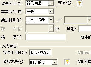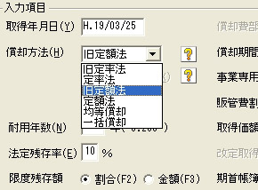 次に管理タブの[減価償却資産登録]をクリック。画面が切り替わったら[新規]をクリックすると登録画面が立ち上がる。ノートPCの場合、資産区分は「器具備品」、勘定科目は「工具・備品」を選択する。償却方法のプルダウンメニューを見ると旧定額法、定額法が選択肢に記載されている。試しに3月購入で定額法を選択してみたら、旧定額法を指定せよとエラーメッセージが表示された。「やよいの青色申告08」は自動的に判断してくれたが、「みんなの青色申告9」では自分で旧定額法か定額法を判断して選択する必要がある。