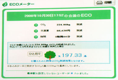 さらに、「ecoメーター」という機能も付けた。例えば遠隔地から会議に参加した場合、会議の開催地までの交通手段を使わなかったことになる。交通費をどれだけ削減できたか。交通手段を使わなかったことでCO2をどれだけ排出せずに済んだか。これらを、金額と杉の木が吸収するCO2の何本分に当たるかのイラストで表示するようにした機能だ。「楽しくコスト削減をしながら、遠隔会議を行う」(ブイキューブ)ためだという。