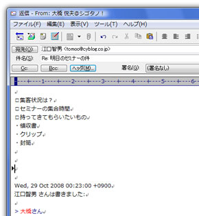 受信トレイを見て、即返信ができるものはしますが、それ以外はどんどん「未処理」というフォルダに移していきます。その後、毎日15分ほど確保している「メール返信タイム」になったら、「未処理」フォルダをのぞいて、返信を書いていきます。その際も、15分という時間枠があるので、「これは書ききれない」と思ったメールについては、途中まで書くなり、書こうと思っている内容を個条書きに列挙するなりして、いったん閉じます。その際、それで忘れてしまわないように、続きを書けるころ合いを見計らってBecky!のリマインダーをセットします。その時間になれば、書きかけのメールが開くので、返信を促されるわけです。