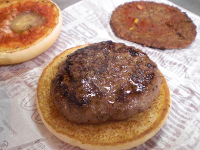今回は比較として、マクドナルドのふつうのハンバーガーを2個買ってきました。1つからパティを抜いて、代わりに自作のパティをはさんでみようというわけです。バンズやケチャップといったパティ以外の条件をそろえることで、パティによる味の違いがはっきりするだろうという考えです。