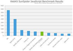 IE9の大きな特徴の1つは、Microsoft社内で「Chakra」と呼ばれる新しいJavaScriptエンジンだ。マルチコアを活用する設計になっており、JavaScriptのコンパイルを、IEと並行して別のCPUコア上でバックグラウンドで行うことで高速化を図っている。ベンチマークテストでは、IE9プレビュー版はIE8をはるかに上回り、Firefoxを超え、SafariとChromeに次ぐスコアをたたき出している。