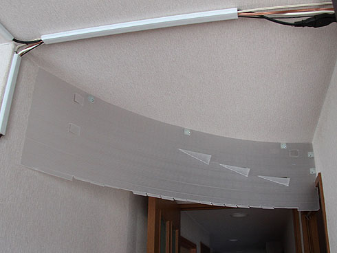 南風が強いときはキッチンにも風は入ってくるが、風が弱いと廊下を抜けるだけでキッチンは熱がこもる。南風微風のときにキッチンに効率よく風を送り込むための対策を考えてみた。廊下の上部に湾曲させたボードを取り付け、受け止めた微風をキッチンに一気にと流し込む仕組みだ。
