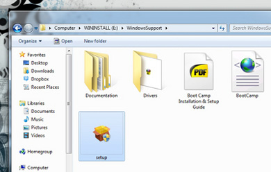 - Windowsエクスプローラを開き、Windows 7インストーラーの入ったUSBメモリを参照します。Windowsサポートフォルダを開き、「Setup.exe」をダブルクリックします。