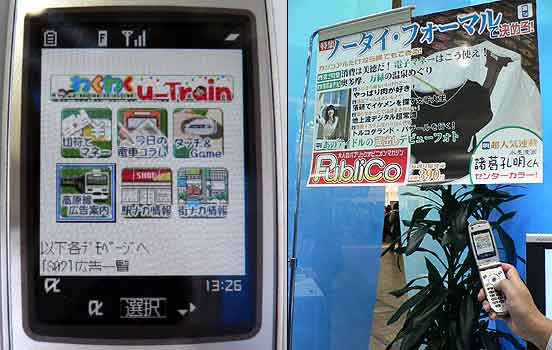 「わくわくu-Train」の起動画面。デモではiアプリ版のみだった。車内で利用できるようなコンテンツが用意されている(左)。車内の中吊り広告と同じテキストが携帯電話に表示され、お金を払えば携帯でそのまま中身の記事を読める。タイトルが気になって中身を読みたいと思っても、電車を降りる頃には忘れていたり、その雑誌が売店で売られていなかったりして記事を読めないということがなくなる(右)