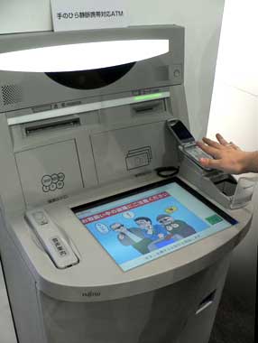 富士通ブースでは、銀行のATMを想定した「おサイフケータイ+手のひら静脈認証」のデモが行われていた。