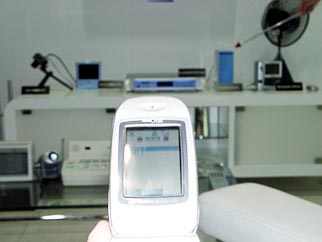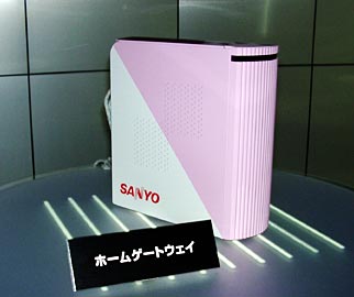 EZ Webで扇風機をコントロール?三洋電機ブースでは,ホームゲートウェイを中心とした家電ネットワークを構築し,EZ Web対応携帯電話を使って扇風機やCCDカメラを操作するデモンストレーションを行っている。