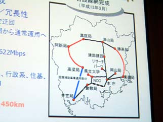 東京から西に約700キロ。「晴れの国」と称されるほど天候に恵まれた岡山県に,自治体主導で造られた高速ネットワークがある。数少ない“地方IT化の成功例”といわれる,この「岡山情報ハイウェイ」は,いかにして誕生し,成長してきたのだろうか? 「e-Drive 2001」の会場で,岡山広域産業情報システム部の美甘幸路氏が講演を行った。 岡山情報ハイウェイは,県庁と県内数カ所にある地方振興局間を自前の光ファイバーで結んだ地域ネットワークだ。現在の総延長は450キロにおよび,帯域幅はATMの155M〜622Mbps。10カ所のPOPと1カ所のNOCがあり,学校や研究機関はもちろん,一般企業も無償で接続している。