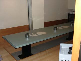 パーティスペースの広さや内装はさまざまだが,もとがカラオケボックスだけに防音は完璧だ。そのうえ大画面TVも標準装備。TV出力付きのノートPCがあれば,プレゼンテーションには最適だろう。「2階のカラオケ&パーティスペースは,もともと個室で料理を食べたいという要望が多かったために作られたもの。食事を意識したテーブルの高さが,会議にもマッチしたようだ」(岡田店長)。
