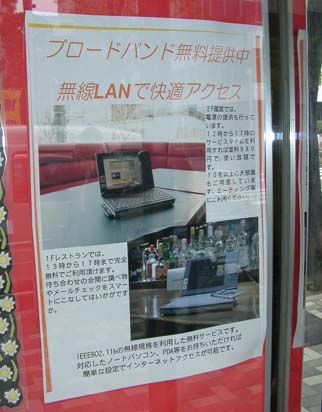 その結果,4月から1階のレジカウンターにメルコ製アクセスポイントが設置され,無料で無線LAN接続を提供している。アクセス回線はアッカ・ネットワークスのADSL。パーティスペースとイタリアン・レストランのカウンター席では,電源コンセントも利用できるのが有り難い。