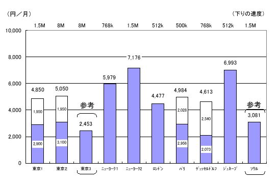 ADSLサービスの料金は、東京がフレッツ・ADSL+OCN ADSLアクセスフレッツプランの場合で、4850円。ニューヨークがVerizon CommunicationsのVerizon Online DSL 住宅用(768Kbps)で5979円、ロンドンがBTBroadbandで4477円となっており、各国のサービスにひけをとらない価格帯であることが分かる。 CATVインターネットの料金も同様に、東京のサービス料金が最も低価格な水準となっている。