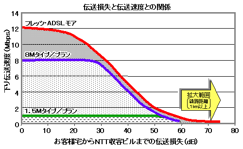 NTT東西地域会社は、11月からサービスを開始する「フレッツ・ADSL モア」の伝送距離を延長することを明らかにした。これは、社内の検証作業を終えたことを受け、発表されたもの。4〜5キロが限界とされていたADSLの伝送距離だが、フレッツ・ADSL モアでは6キロ程度まで延長が可能になるという。 伝送距離の延長により、個々のNTT局に収容されているユーザーのカバー率が向上する。「従来の8Mbpsメニューでは、カバー率は約87%にとどまっていた。しかし、フレッツ・ADSL モアにより、約96%をカバーできるようになるだろう」(同社)。 ただし、ADSLの伝送速度は、NTT収容局からの距離や伝送損失に大きく左右される。同社は、今回の発表に合わせて、検証データに基づく距離と伝送速度のグラフを明らかにした。これを、NTTが公開している「線路情報開示システム」(3月の記事を参照)と併せて利用することで、おおよその伝送速度を算出することができるとしている。