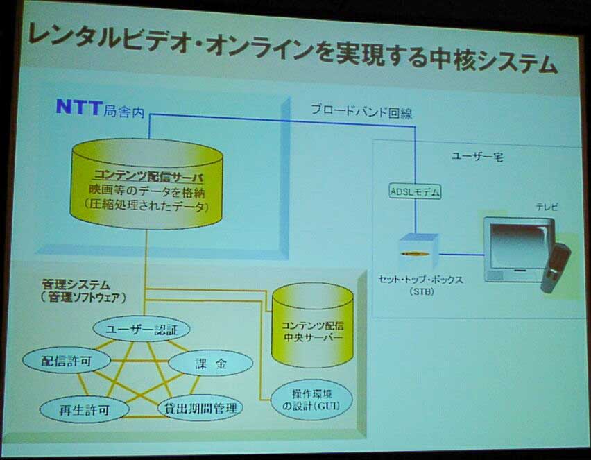 3つ目の軸が、専用STBを利用する映像ダウンロードサービス「レンタルビデオ・オンライン」だ。これはNTT局舎内に設置されたコンテンツ配信サーバから、ユーザー宅内のSTBまでブロードバンド回線経由で映像を伝送するサービス。映像はアナログ変換され、テレビ画面に出力される。