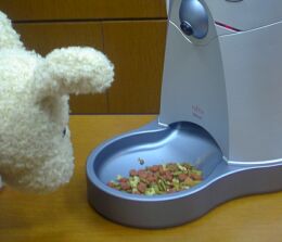 ![]() えさが出た! 中に入れるドッグフード(キャットフード)は5−7ミリ、乾燥したものが望ましい 携帯電話の対応サイトも用意されており、PCと同様に端末を操作できる。「次期バージョンでは、携帯でしゃべりかけると端末から声が出る、というサービスも検討している。ペットとより密接なコミュニケーションが可能になるだろう」(同社)。