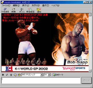緊急時にボブ・サップが登場!するメッセンジャーヤフーは、フジテレビと共同で「K-1」をモチーフとしたYahoo!メッセンジャーの配布を開始した。12月7日までの期間限定で、K-1参戦選手8人から好きな選手を選んで表示できる