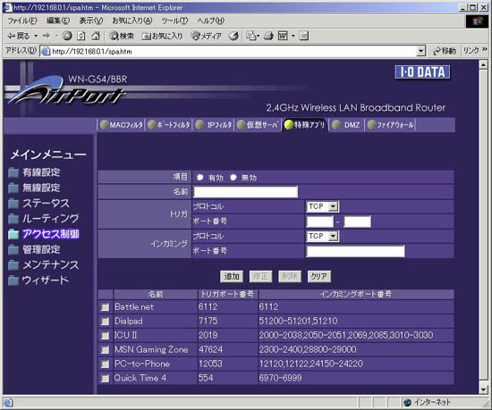 標準クラスより上のモデルでは対応が当たり前となった“UPnP”は、もちろん対応している。ネットワークゲームなど、NATを通過できないアプリケーションは、“仮想サーバ機能”“仮想DMZ機能”“特殊アプリ機能”などを用いることにより利用できるようになる。各アプリごとの設定例はマニュアルには掲載されていなかったが、こちらのWebページが参考になるだろう。“特殊アプリ機能”は、複数のポートを利用するアプリの場合に用いられる。通信のきっかけとなるポート番号(トリガ)と、受け入れるポート番号(インカミング)を設定する。