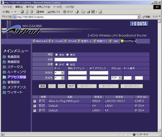 従来の静的なパケットフィルタを設定した経験のある方にはお判りいただけると思うが、「外部からのアクセスはすべて遮断、内部からのアクセスはすべて許可」のような設定でも、静的フィルタでは、例えば「外部からの不正アクセス」と、「内部から外部のWebサーバにアクセスした際に、外部のWebサーバから送られてくるデータ」とを区別するために、TCPのフラグをチェックして、ややこしいフィルタリングルールを設定しなければならなかった。SPIは、これらを区別してくれるため、文字通り「外部からは拒否、内部からは許可」とだけ設定すればよい。実際、デフォルトではそのように設定されていた(さらに外部からPingを許可するフィルタも設定されている)。実際にはアドレス変換機能(NAT)によって、ほとんどのパケットは内部LANに侵入することはないが、NATによる防御だけでは心配な方には、心強い機能であろう。もちろん、サーバを公開するような環境では、かなり役に立つ。