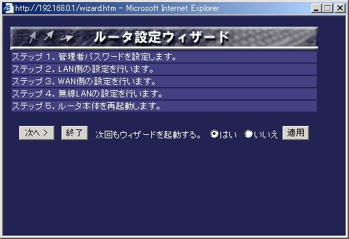 設定はWebブラウザによって行う。設定画面への最初のアクセスでは「ルータ設定ウィザード」が立ち上がる。このウィザードの指示に従って入力していくだけで、一通りの設定を行うことができる。