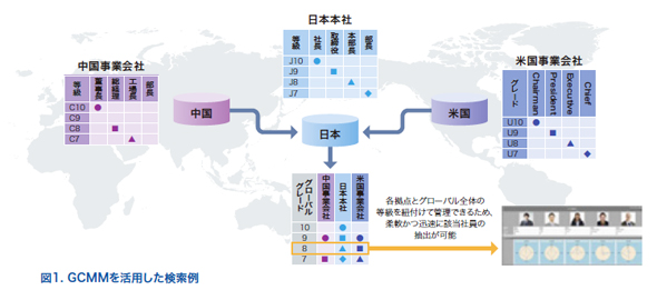 例えば「全拠点の本部長クラスの人材を検索したい」という場合、各社の人事体系がバラバラでも、GCMM上では「本社の『本部長』」「中国現法の『総経理』」「米国の『Executive』」などを同一のグレードとして紐付けて管理しておくことができます。これにより、ユーザーは、該当する人材を容易にリストアップすることができます。また「役職」だけではなく、「資格」や「スキル」などもマッピングルールを定義して紐付けておくことができるので、さらにきめ細かい条件で検索することも可能です。(図1)