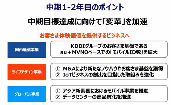 国内通信事業では、顧客基盤であるauとMVNO向け契約者数のさらなる増加を図る。ライフデザイン事業では、M&Aによって新たなノウハウを獲得しつつ、IoT(モノのインターネット)関連ビジネスの創出を目指す。グローバル事業では、ミャンマー・モンゴルでのモバイル事業などを推進していく。